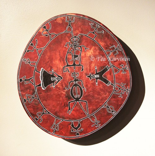 Esi-isämme ja sukupolvien ketju. Keskellä esi-isämme, ympärillä suku tähän päivään asti. Sivulla keskellä mies ja nainen. Rumpu by Elli-Maaret Helander.