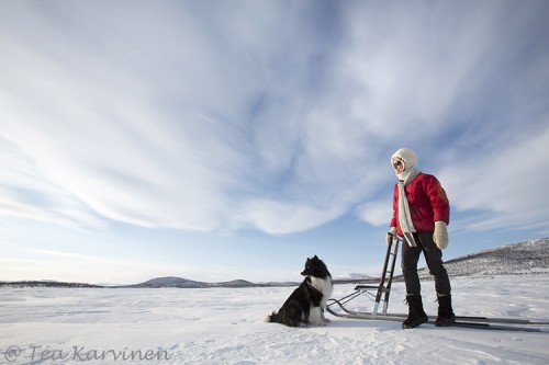 Leena Valkeapää kotonaan Kilpisjärven Kivijärvellä maaliskuussa 2013. Leena ja koira Biggo postinhakumatkalla. Kertajulkaisuoikeus.