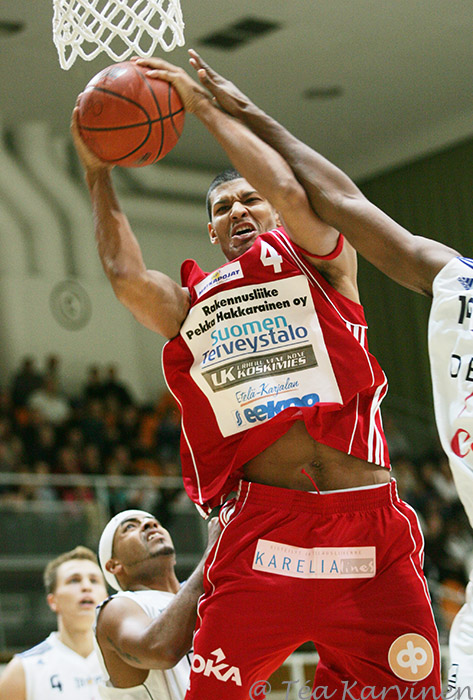 Torpan Poikien pelaajat vas. Fowzi Abdelsamad ja Jordan Harris (oik.) yrittävät estää Lappeenrannan NMKY:n pelaajaa amerikkalaista Matthew Williamsia.