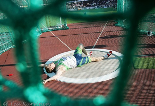 IS 20060726 HELSINKI GE MONEY GRAND PRIX YLEISURHEILU KILPAILU OLYMPIASTADION, OLLI-PEKKA KARJALAINEN HEITTI MOUKARIA JA KUPSAHTI KUMOON, KOMPASTUI HEITON AIKANA, O-P MAKAA HEITTORINGISSƒ PETTYNEENƒ. BY TEA KARVINEN